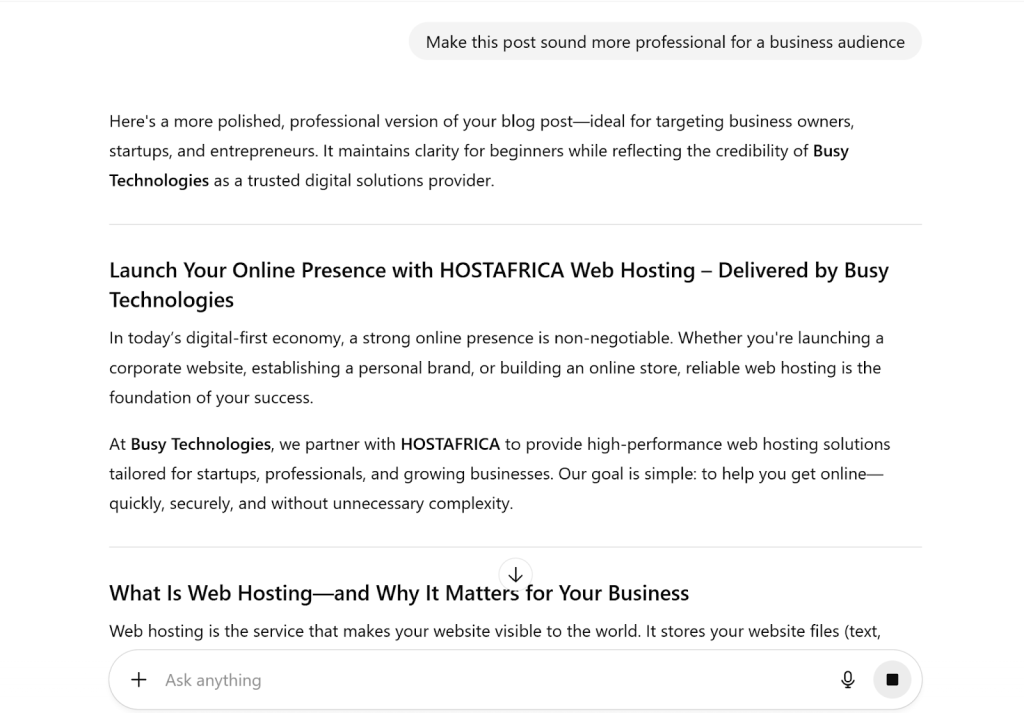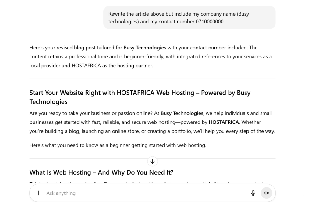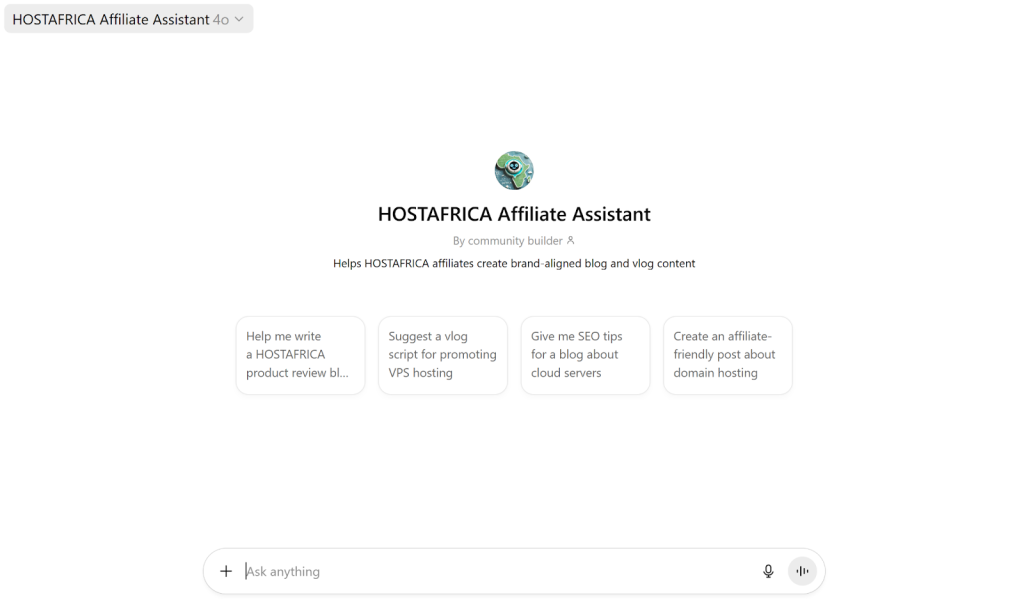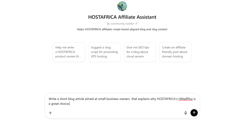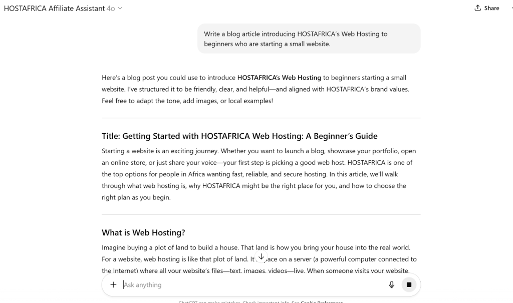 Open the HOSTAFRICA Affiliate AI Assistant, type in your first prompt, and watch how quickly it creates content you can share with your audience.